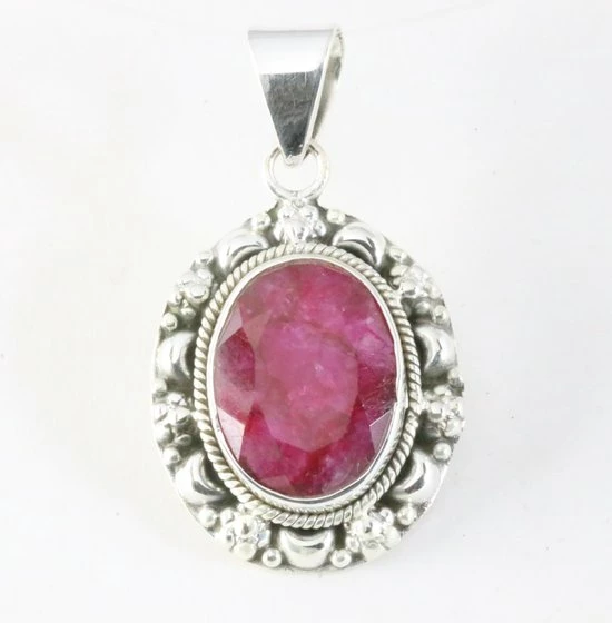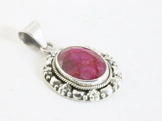 Handgemaakte en bewerkte ovale zilveren hanger met een mooie gefacetteerde robijn steen. Het zilvergehalte is 925.