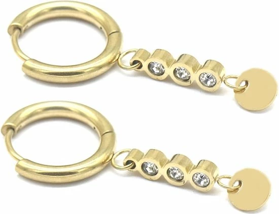 Super leuke oorringen met daaraan als hangertje een bedeltje met drie steentjes erin. Hieronder hangt nog een kleine muntje.