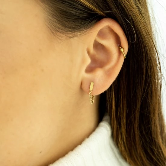 Oorknopjes met kettinkje. De stud heeft de vorm van een staafje. Aan de stud hangt een kettinkje met daaraan vast een achterkantje. Het staafje is 6 mm bij 2 mm, het stokje aan de stud is 11 mm lang en het kettinkje is ongeveer 20 mm lang en 1 mm breed. De totale lengte van de oorbel wanneer je deze draagt is ongeveer 18 mm. De oorbellen worden verkocht per paar. De knopjes zijn gemaakt van stainless steel (roestvrij staal), wat betekent dat ze niet verkleuren, waterproof zijn en nikkel- en allergeen vrij zijn. Ook is dit materiaal heel licht (1 gram), waardoor deze oorbellen fijn te dragen zijn. Deze oorknopjes zijn verkrijgbaar in de kleuren zilver en goud. Ze zijn geschikt voor volwassenen en kinderen.