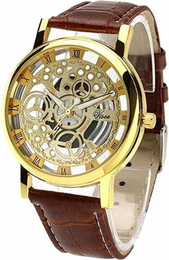 Een klassiek quartz horloge met een bruine PU lederen band, goudkleurige kast en een open goudkleurige wijzerplaat waardoor dit horloge een exclusieve uitstraling heeft. Het horloge heeft zowel aan de voor- als aan de achterzijde een glazen plaat waardoor je door het horloge kunt kijken. De onderverdeling bestaat uit Romeinse cijfers. De horlogekast heeft een diameter van 40mm en de totale lengte is ongeveer 24cm.