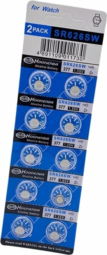 Deze Koonenda batterij is van hoge kwaliteit en ook wel bekend onder de naam AG4, SR626SW, SR626, LR626, L626, S626E, SR66, LR66, V377, D377, GP377, 377, 377A, G4A, G4, SG4, 376, 606, 565, 177, GP77, SB-AW, 280-39, BA (1,55V)