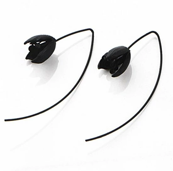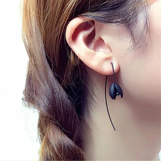 Sierlijke doortrek-oorbellen met een zwarte tulp (glans).