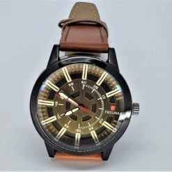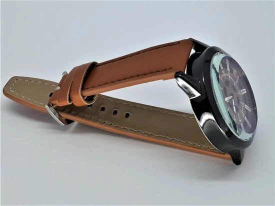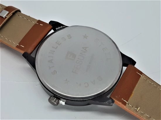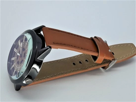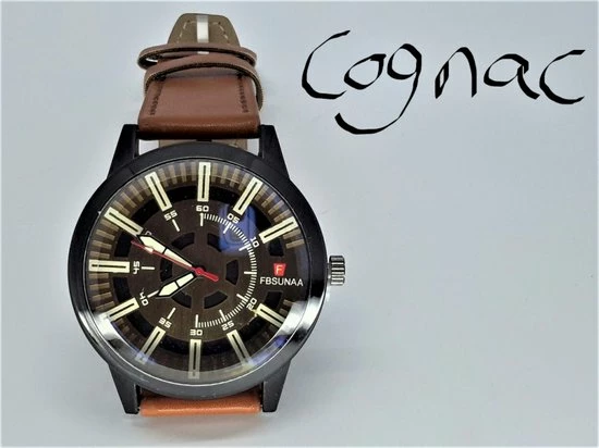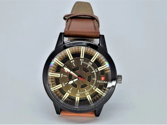 Cognac-kleurige FabSuna horloge met een zwart metalen kast, pendelvormige uur- en minutenwijzers, smalle secondenwijzer.