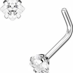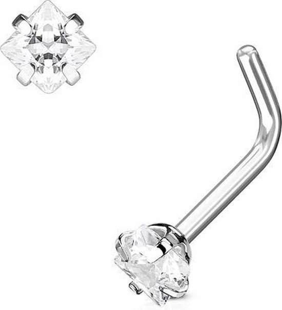 Neuspiercing met een mooie witte vierkante steen. Het staafje heeft een hoek waardoor deze fijn in het draagcomfort is.