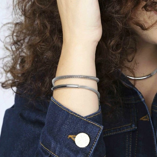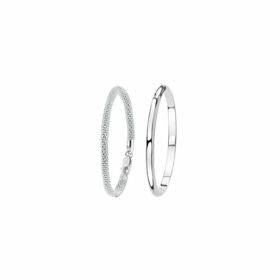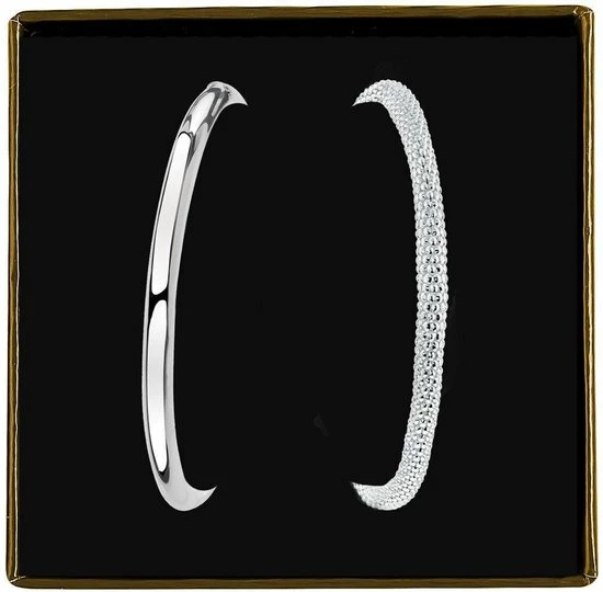 Deze mooie set is gemaakt van het materiaal zilver. Het setje bestaan uit twee armbanden waarvan één bangle en een popcornarmband. De bangle heeft een diameter van 62 mm en de popcornarmband heeft een lengte van 19 cm. Deze set wordt geleverd in een cadeaudoosje.
