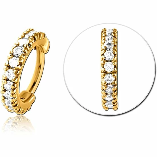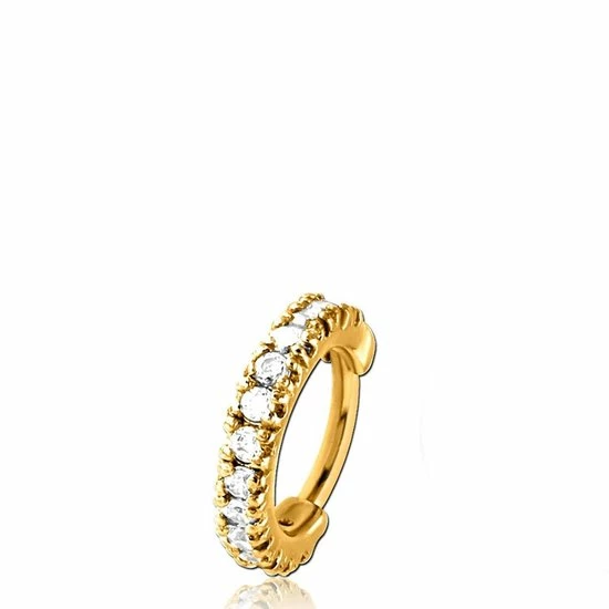 Deze goldplated tragus piercing is versierd met mooie zirkonia steentjes. De piercing heeft een diameter van 6 mm en een dikte van 1 mm. Breedte van de pin: 1,00mm Binnen diameter: 6,00mm
