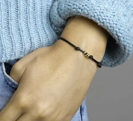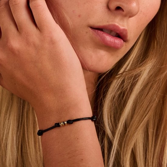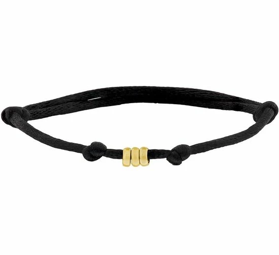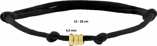 Zwart gevlochten armband uitgevoerd met 14k geelgouden ringetjes. De armband heeft draaglengtes van 13 tot 26cm. De ringetjes hebben een diameter van 4.5mm.