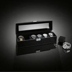- Deze horlogebox is praktisch, heeft een lederlook met veloursuitvoering en 6 aparte vakken met uitneembare horlogekussens