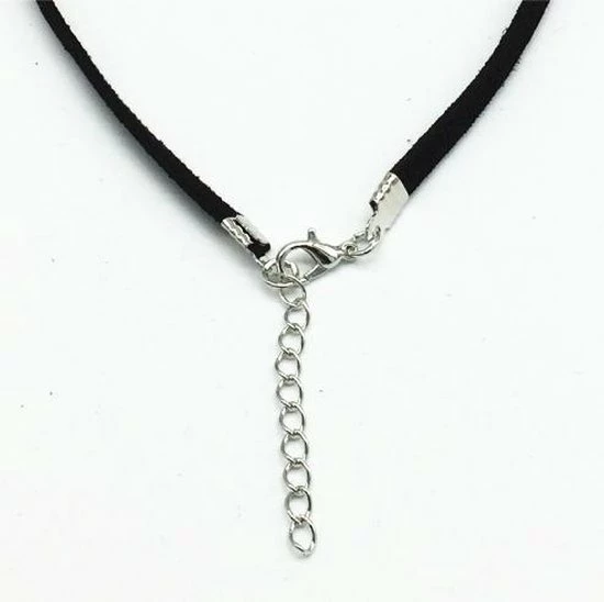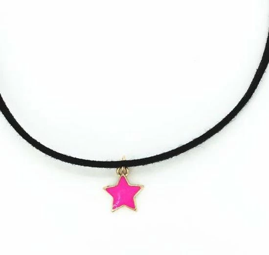 Korte lederen zwarte ketting / choker met glanzend materiaal die hoog in de hals gedragen wordt. Er hangt een klein roze sterretje. De ketting is ongeveer 37 centimeter en heeft een verstelbaar slotje.