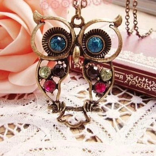 NiSy.nl Vintage ketting met Uil | Vogel met gekleurde steentjes | Retro Bronskleurig