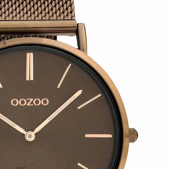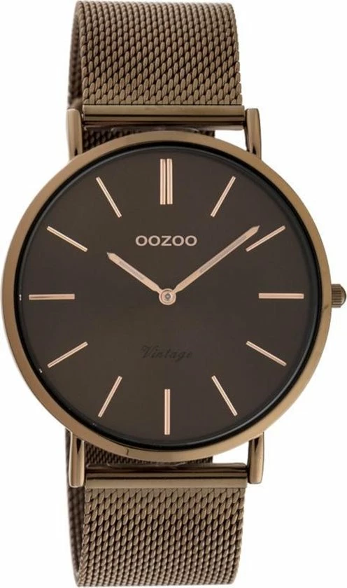 De klassieke look blijft centraal staan in deze trendy serie en daarom is dit OOZOO vintage ronde design met een speelse knipoog dé musthave van het seizoen! Dit unisex horloge is de perfecte combinatie van comfort en fashion met zijn 40 mm bruine metalen horlogekast en bruine sunray wijzerplaat. De wijzerplaat heeft rosé gouden strepen tijdsaanduidingen en bijpassende kleurige wijzers. De bruine metalen mesh armband maakt dit horloge tot een trendy accessoire dat je elke dag kunt dragen. Dit horloge voegt de sprankeling toe aan je outfit. Het mineraalglas ligt in een 6,9 mm dunne metalen horlogekast met IP-plating. Dit ontwerp heeft een stainless steel achterplaat en is nikkel-safe. Dit horloge heeft een 2ATM Japans uurwerk en wordt gedekt door een garantie van 2 jaar .