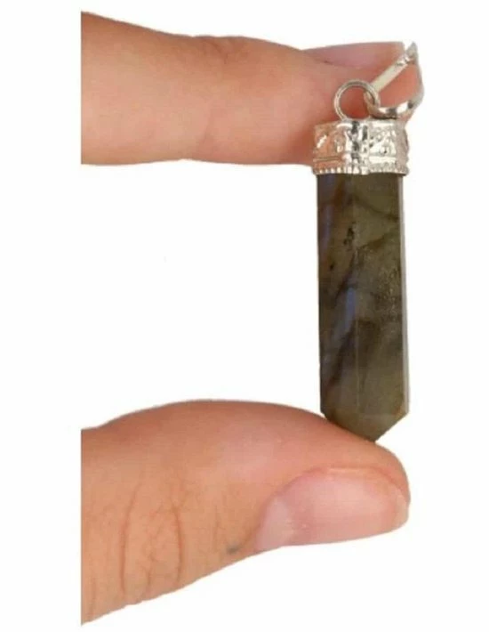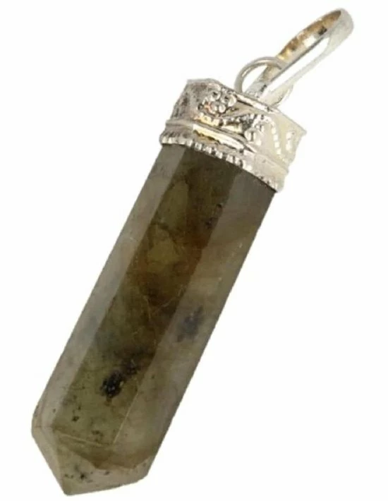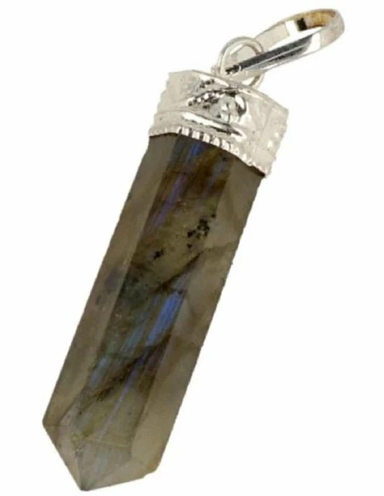 Punt hanger in 6 facetten geslepen van Labradoriet. Het kapje is verzilverd, ca. 45 mm lang.