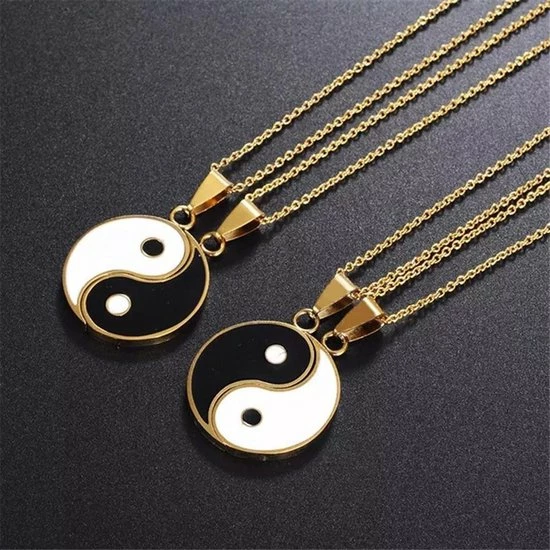 Vriendschapsketting Yin Yang bestaande uit twee kettingen met hanger. De kettingen hebben een lengte van 45cm en kunnen nog 5cm verlengt worden.