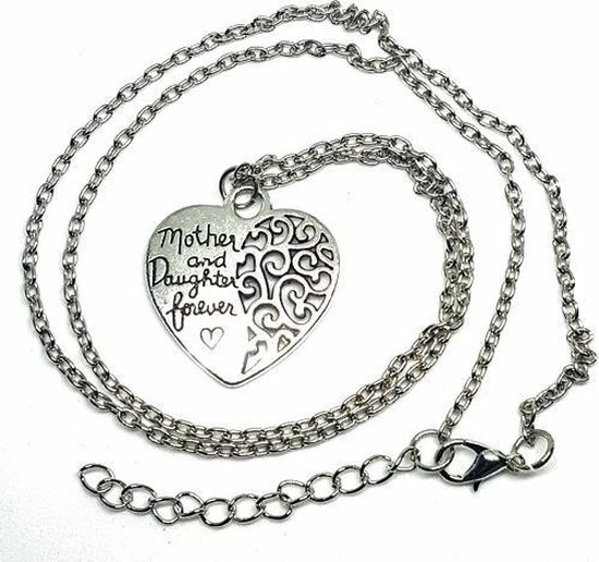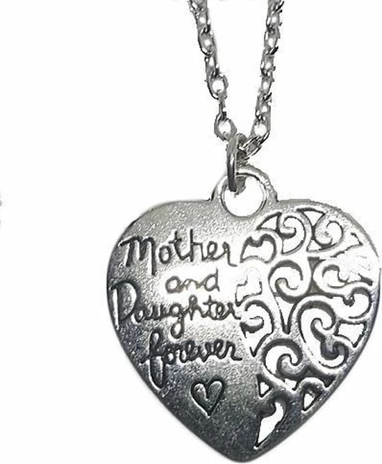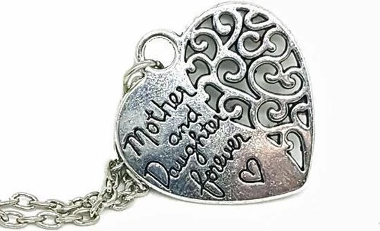 Een zilverkleurige ketting met hart hanger om de mooie band tussen moeder en dochter aan te tonen.