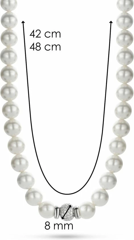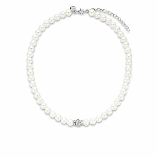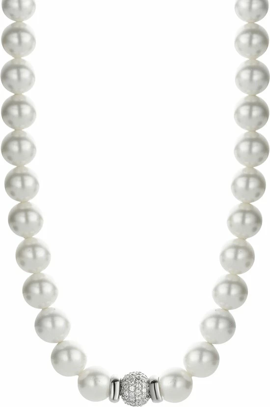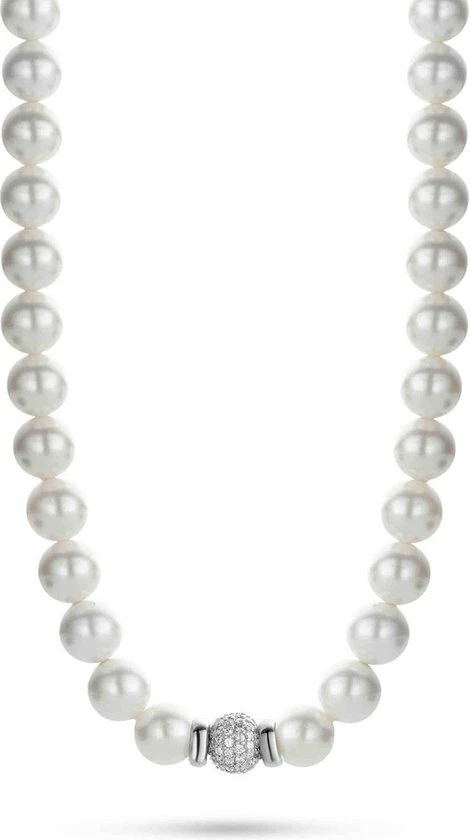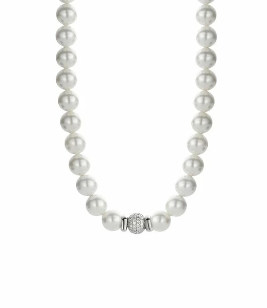 Dit TI SENTO – Milano collier is geregen met witte parels. Het middelpunt van het collier wordt gevormd door een bol van pavΓ© gezette zirkonia’s, die aan beide zijden worden omringd door een zilveren kraal. Door het gebruik van verschillende materialen, kan dit collier zowel mooi worden gecombineerd met andere parels als met zirkonia sieraden uit de TI SENTO – Milano collectie. Of er kan worden gekozen om beide materialen te combineren volgens het TI SENTO – Milano Mix & Match concept.
