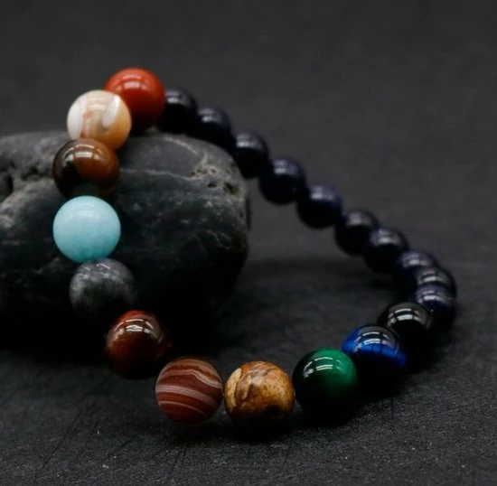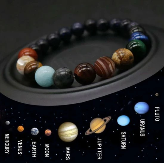 Deze stoere en trendy kralen armband is gemaakt van 8 mm grote natuurstenen kralen donkerblauw Galaxy en 10 mm grote natuurstenen kralen die de diverse planeten symboliseren, te weten Pluto, Uranus, Saturnus, Jupiter, Mars, Maan, Aarde, Venus, Mercurius en de Zon.